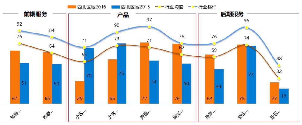 從下方圖形中可看出:XXXX西北區(qū)域業(yè)主在銷售服務(wù)、收樓交房、房屋設(shè)計(jì)、房屋質(zhì)量、維修服務(wù)、物業(yè)服務(wù)、投訴處理七大方面的滿意度評價相比去年有所提升,但業(yè)主對小區(qū)配套、小區(qū)環(huán)境和規(guī)劃兩個方面的滿意度評價相比去年有所下降,每個客戶體驗(yàn)端口與行業(yè)均值*及行業(yè)標(biāo)桿*均存在較大差距,所以后期仍需努力提升。
