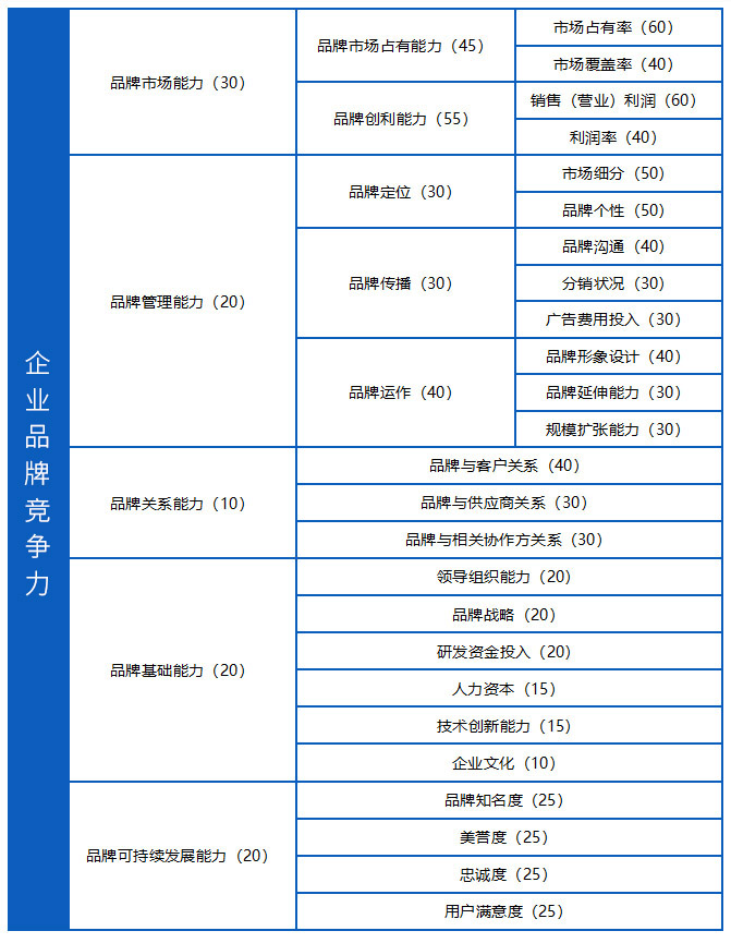 (4)品牌基礎能力,是指打造品牌需要做的基礎工作,包括領導組織能力、品牌戰略、研發資金投入、人力資本、技術創新能力和企業家及企業文化。其中,只有研發資金投入是定量指標,指當年在研發中投入資金的數量與當年銷售額總量之比。